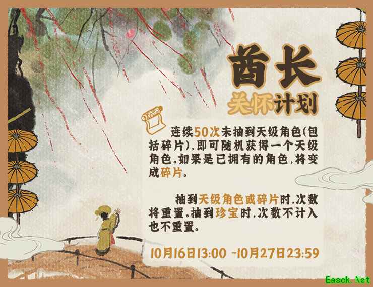 活动时间: 10月16日13:00—10月27日23:59 活动内容: 活动期间内,若连续50抽没出天级角色及天级碎片(抽到珍宝不算),就可以随机领取一个天级角色,若该天级角色是重复拥有的,则会变成碎片。 以上就是小编整理的江南百景图酋长关怀计划活动内容介绍,想知道更多相关资讯攻略的请关注手游网。 |