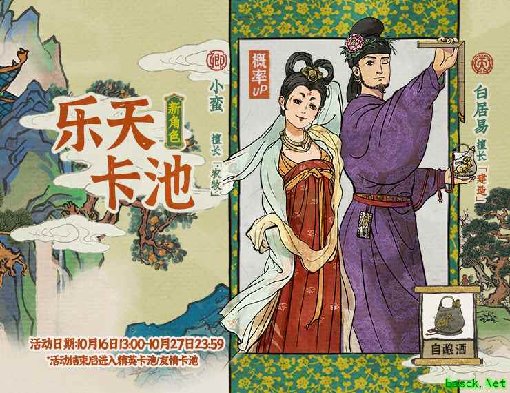 乐天卡池UP活动内容介绍: 活动时间: 10月16日13:00—10月27日23:59 活动内容: 1、天级新角色【白居易】&卿级新角色【小蛮】共同进入【乐天】卡池。 2、活动期间【白居易】、【小蛮】概率UP! 3、活动结束后【白居易】进入【精英】卡池,小蛮进入【精英】&【友情】卡池。