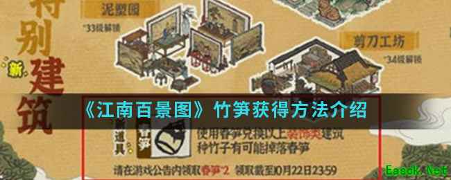 竹笋获得方法介绍: 1、第一种就是免费获取 在杭州城更新后小伙伴们可以选择在10月22日23:59分前通过游戏公告领取,数量为2个; 2、第二种是通过种植竹子 1、这是小伙伴们长期获得春笋的重要途径,在种植时有一定的概率产出和掉落。 2、当然了,无论哪一种,小伙伴都应当做好囤积,以备不时之需。 以上就是小编整理的江南百景图竹笋获得方法介绍,想知道更多相关资讯攻略的请关注手游网。 |