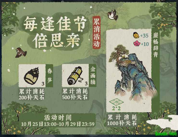 活动时间:10月25日13:00—10月29日23:59 活动期间内,累计消耗200补天石,即可领取【春笋*3】; 累计消耗500补天石,即可领取【金画轴*3】; 累计消耗1000补天石,即可领取【崖松辞青】。 以上就是小编整理的江南百景图重阳节活动内容介绍,想知道更多相关资讯攻略的请关注手游网。 |