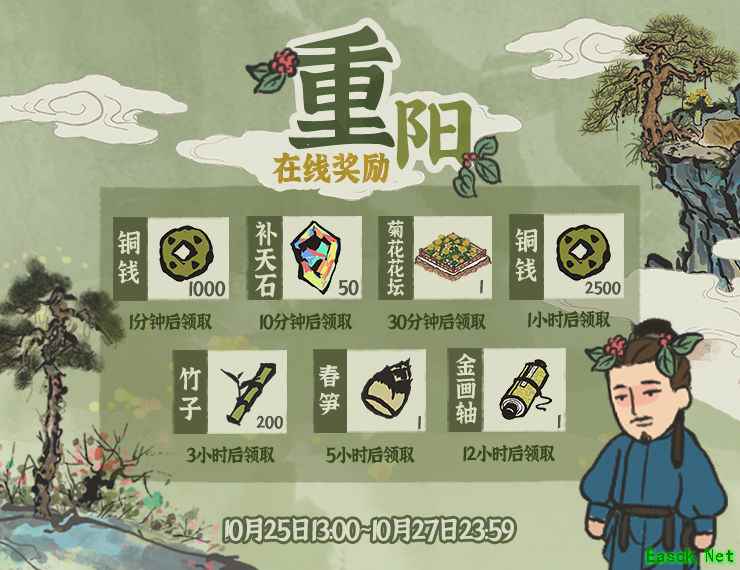 活动时间:10月25日13:00—10月29日23:59 在活动期间内,江南小镇居民脑袋上会插上茱萸,据说能驱邪治病哟~ 【重阳节在线奖励】