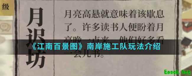 在江南百景图手游中南岸施工队怎么玩呢?南岸施工队是西湖疏浚工程中的一个施工队,总共有五个,一个施工队的任务全部完成后施工队会出现一个小亭子,那么想知道南岸施工队玩法的就跟随小编一起来看看吧。