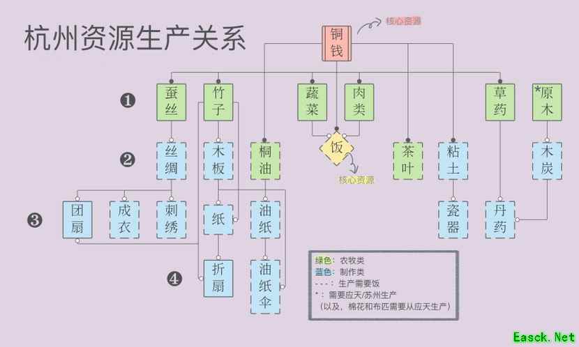 杭州资源生产关系分享介绍: 1级资源用(铜钱}生产 2级资源用(铜钱、1级资源、饭}生产 3级资源用(1/2级资源、饭}生产 4级资源用(1/2/3级资源、饭}生产 铜钱和饭比较特殊,可以分别算作0级和1.5级