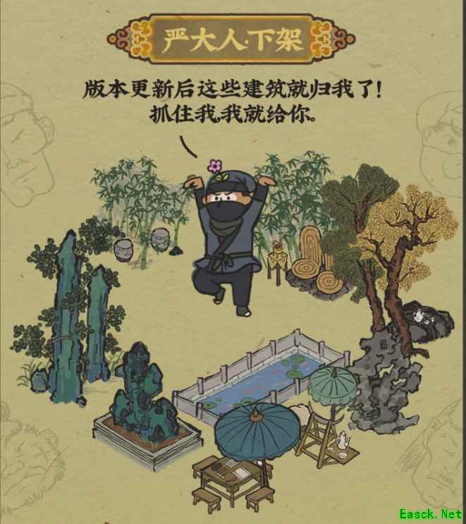 严大人下架建筑介绍: 一、下架建筑 1、早餐摊 2、算卦摊 3、青石盆景 4、太湖石 5、打坐石 6、竹林雅座 7、歇脚石 8、双子峰 9、金鱼池 二、下架时间 11月中旬版本更新后。 三、获得方法 这些建筑在严大人下架后,需要通过抓捕盗贼审问后获得。