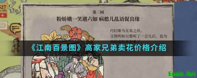 在江南百景图手游中高家兄弟卖花价格怎么样呢?游戏中每家的卖花价格都不相同,很多小伙伴想知道高家兄弟的卖花价格,那么想知道高家兄弟卖花价格的就跟随小编一起来看看吧。