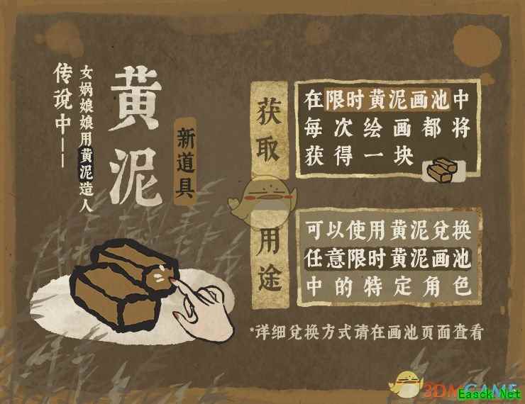 每次在【限时黄泥卡池】中绘画都将获得一块【黄泥】。 【黄泥】积攒到一定数量,即可用于兑换【限时黄泥卡池】中(不局限于当期)任意特定角色,每个角色仅可兑换一次。 以上就是小编整理的江南百景图风物弥新活动预告内容介绍,想知道更多相关资讯攻略的请关注手游网。 |