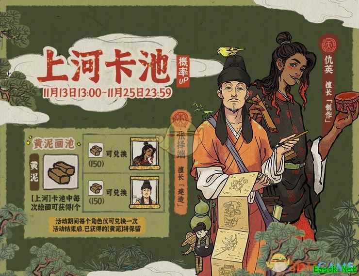 卡池UP时间:11月13日13:00—11月25日23:59 天级新角色【张择端】&天级新角色【仇英】概率UP! 限时黄泥卡池,可积攒新道具【黄泥】,用于兑换特定角色。每个角色仅可兑换一次。 【新道具:黄泥】