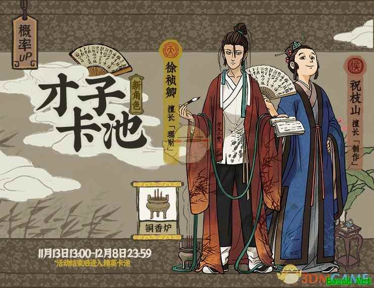卡池UP时间:11月13日13:00—12月8日23:59 天级新角色【徐祯卿】&侯级新角色【祝枝山】共同进入【才子】卡池。 活动期间【徐祯卿】、【祝枝山】概率UP! 活动结束后【徐祯卿】、【祝枝山】进入【精英】卡池。 【上河卡池(本期黄泥卡池)】