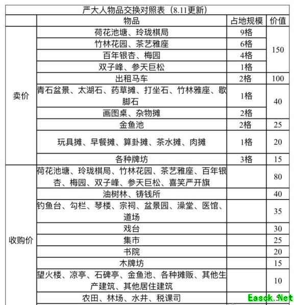 二、兑换攻略 获取方法:严大人,价值40的建筑可以兑换。 1、40个告示牌。 2、5个告示牌+2望火楼+1木牌坊。 小技巧:有江湖消息称,严大人在多年的买卖生涯中,形成了自己独有的一套价值交换体系。(以告示牌为例,在严大人的眼中,价值为1,竹林花园价值为150,虽然严大人对于告示牌很是不屑,但如果我们凑够150个告示牌也不是不能商量的)。