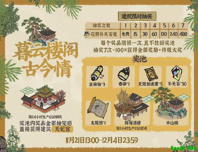 《江南百景图》暮云楼阁古今情活动介绍一、活动时间 11月21日13:00——12月4日23:59 二、活动详情 活动期间内,前往州府内公告处,可以参与限时抽奖活动! 奖池内奖品限领1次,抽到的奖品会从奖池中剔除,不会被重复抽取。 第一次抽奖为免费抽取。 第二次抽奖花费补天石*15颗。 第三次抽奖花费补天石*30颗。 第四次抽奖花费补天石*60颗。 第五次抽奖花费补天石*120颗。 第六次抽奖花费补天石*240颗。 第七次抽奖花费补天石*480颗。 抽奖7次共需花费补天石*945颗。 全部抽完后可直接领取额外大奖:天妃宫*1个。 具体奖池详情请知府大人们查看下方配图。