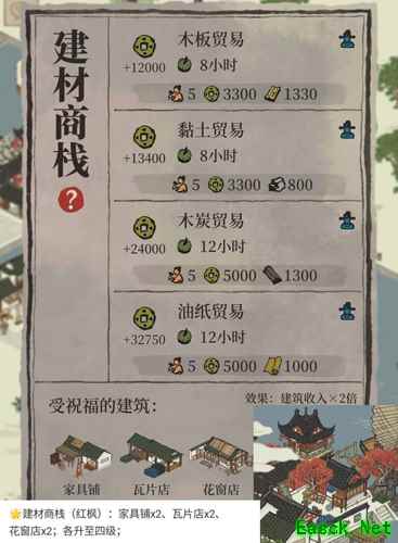 关于商栈升级推荐: 特产商栈:灯笼店,折扇店,团扇店,这3个都分别建造2个,而且等级都需要达到四级。 建材商栈:家具铺,瓦片店,花窗店,都分别建造2个,等级推荐升级达到四级。 文化商栈:画室,瓷器店,伞店,都分别建造2个,等级推荐升级达到四级。 便民商栈:成衣店,药铺,油店,都分别建造2个,等级可以同时升级达到四级。 这些都推荐放在旁边,总的可以建造5个商栈,就不需要一直替换,每个商栈的要求也有所不同,都归属成为特色商栈,就需要有各种扇子店铺在旁边的位置。 在这款游戏中的建造都很有特色,但是时间长的话就比较枯燥,基本还是需要回归刷钱,然后收集材料,盖房子,城市布局。 以上就是《江南百景图》商栈升级方法介绍的全部内容了,更多手游攻略请关注手游网! |