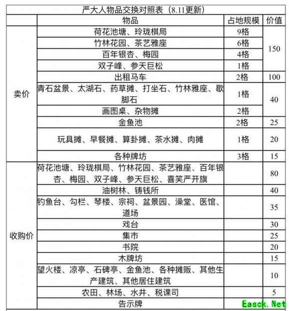《江南百景图》竹林花园用什么换一、告示牌 有江湖消息称,严大人在多年的买卖生涯中,形成了自己独有的一套价值交换体系。(以告示牌为例,在严大人的眼中,价值为1,竹林花园价值为150,虽然严大人对于告示牌很是不屑,但如果我们凑够150个告示牌也不是不能商量的)具体见下图。 二、喜笑颜开旗 严大人对喜笑颜开旗是特别的喜爱,有80的价值。 三、盗贼奖品 玩家审问盗贼后获得的建筑可以攒起来与严大人兑换,有些建筑的价值还是挺高的。据说在苏州开盗贼的礼包会有更好的奖励出现。 四、魏九天 用魏九天在应天刷家具铺,大概只需要两分钟,还能有钱拿,家具铺的价值也非常的高。 五、兑换表