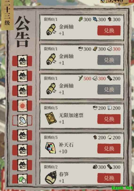《江南百景图》为有暗香来第一天资源兑换攻略一、金画轴 1、蔬菜*300,肉类*300,原木*300,限购一次。 2、菜肴*300,木板*300,丝绸*300,限购一次。 3、竹片*300,丝绸*300,木炭*300,限购一次。 二、无限加速票 菜肴*200,纸*200,限购五次 三、补天石 原木*200,棉花*200,限购五次 四、春笋 黏土*300,木炭*300,限购2次