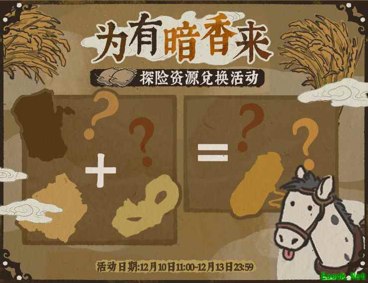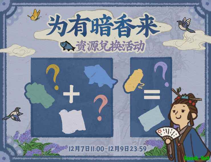 活动日期:12月7日11:00~12月9日 23:59 活动规则: 在活动期间内,搜集指定的生产类资源即可在活动界面兑换相应的奖励。 【为有暗香来】探险资源兑换活动
