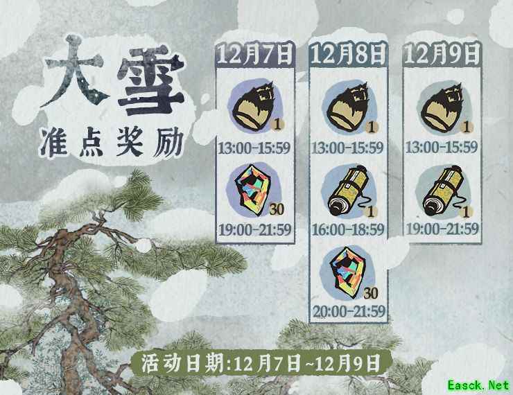 活动日期: 12月7日~12月9日 活动规则: 活动期间内,在规定时间内登录游戏即可获得奖励 12月7日 13:00~15:59登录游戏,即可获得春笋*1 19:00~21:59 登录游戏,即可获得补天石*30 12月8日 13:00~15:59登录游戏,即可获得春笋*1 16:00~18:59登录游戏,即可获得金画轴*1 20:00~21:59 登录游戏,即可获得补天石*30 12月9日 13:00~15:59登录游戏,即可获得春笋*1 19:00~21:59 登录游戏,即可获得金画轴*1 【为有暗香来】生产资源兑换活动