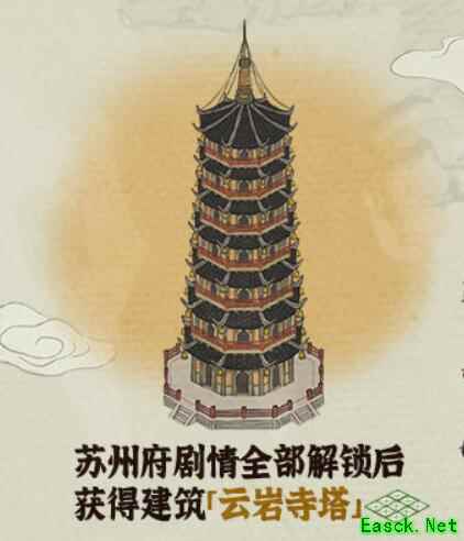 《江南百景图》云岩寺塔获取方法介绍一、获得方法 苏州府探险剧情全部解锁后可获得建筑云岩寺塔。
