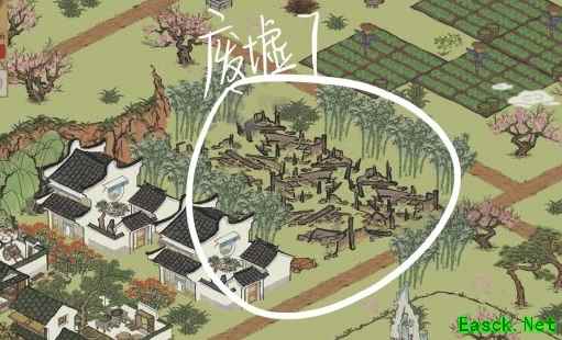 废墟8(修复后是草堂) 废墟8变身需要将下图的树坑栽种,到达树坑需要砍掉杂花花丛。