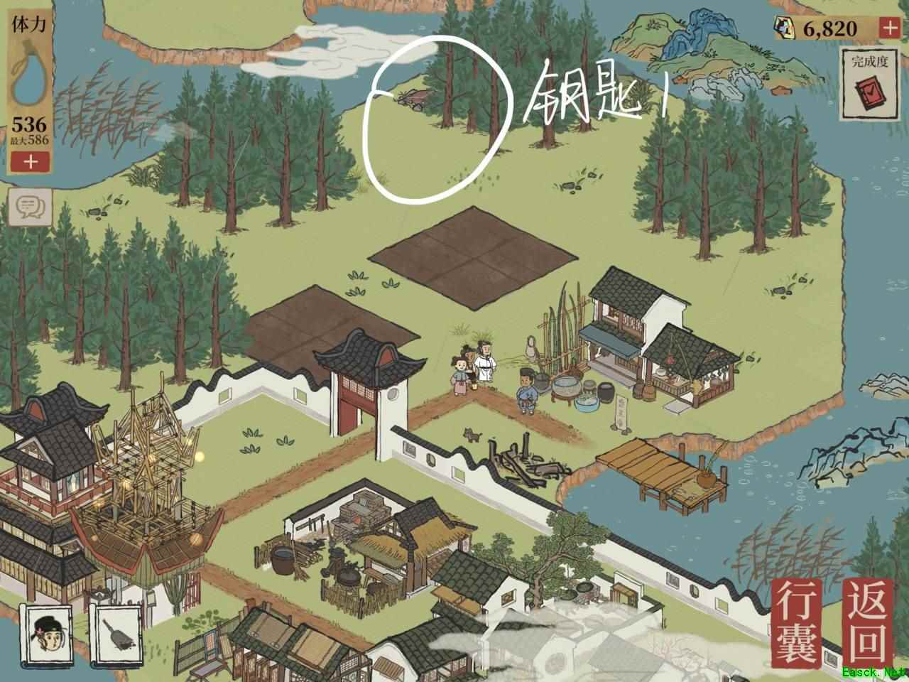钥匙3 旁边有望火楼,在众人吃斋的地方下面