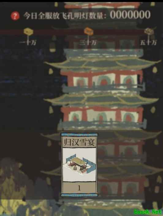 二、兑换物品 永久[归汉雪宴],侯级角色[苏武],孔明灯,竹间雅座,歇脚石,太湖石,金鱼池,补天石*20,铜钱*500。 三、灯会玩法 2020年12月21日 20:00~2021年1月3日 23:59期间 1、活动开启时,获得临时建筑【归汉雪宴】;