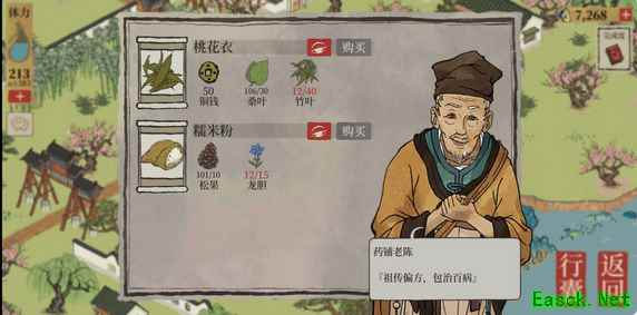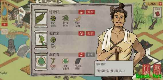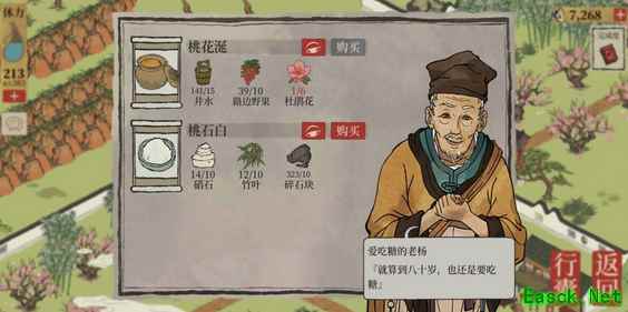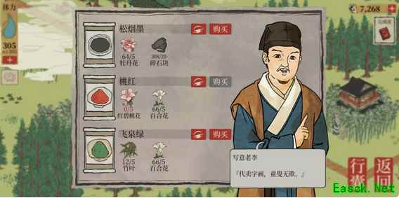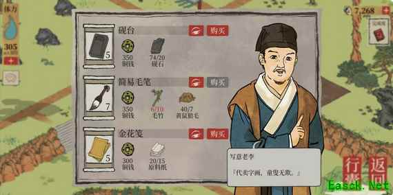 3、【虎丘】 店铺售卖:酒、烟熏肉;竹叶杯、毛竹米、深竹青;砚台、简易毛笔、金花笺;松烟墨、桃红、飞泉绿。 稻田 铁矿、黑石、巨石 枯树、柳树、竹、 野猪、黄鼠狼、野草 牡丹花丛、百合花丛 纸浆池 店铺1(木炭摊)