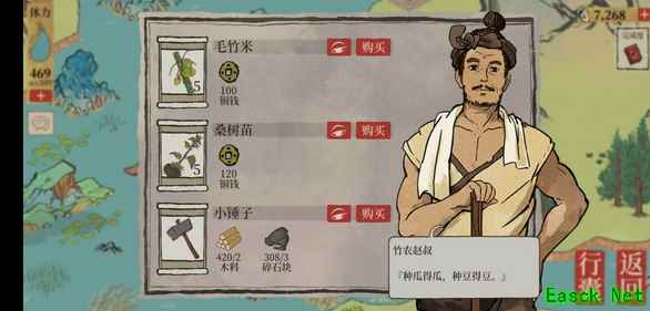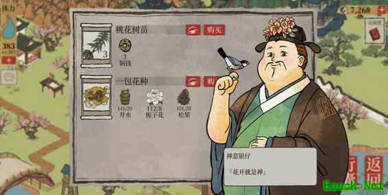 4、【桃花坞】 店铺售卖:桃花树苗、一包花种;桃花衣、糯米粉;桃花涎、桃石白。 野草、蚯蚓、野猪、水井 栀子花丛、杜鹃花、龙胆草、凤仙花丛、石边花丛、普通花丛 桃林白石、巨石、铁矿 枯树、柳树、松树、竹、桑树、梨树 农田、稻田、坞外农田(获得【一篮蔬菜】) 店铺1(盆景园)