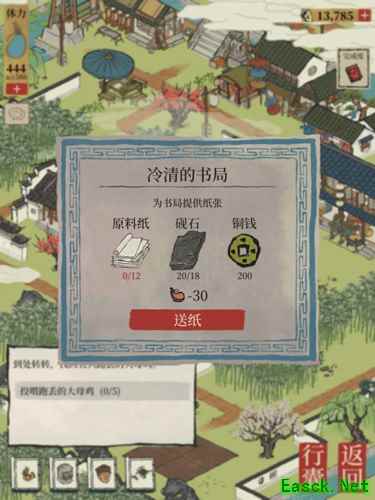 原料纸,在书局旁边的纸浆池可以获得,砚石,在书局旁边的黑石可以获得。 任务:送纸给冷清的书局 兑换需要: 原料纸*12,砚石*18,铜钱*200,体力30,两个书局,所以需要两份。