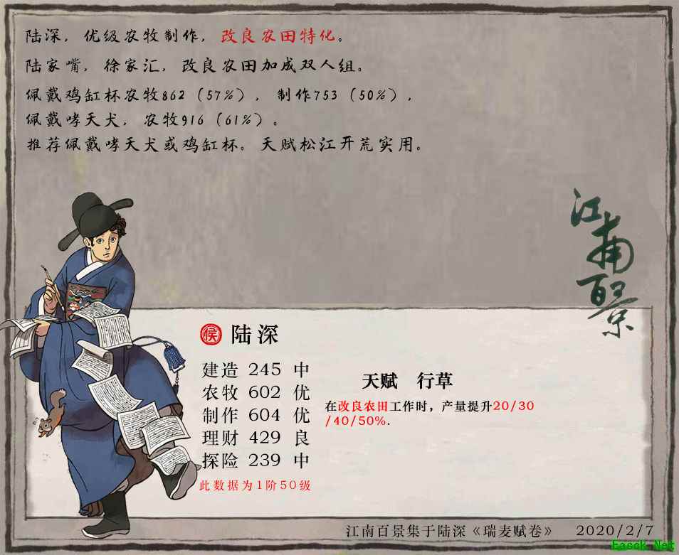 《江南百景图》陆深培养攻略【人物属性】 初始属性:建造100,农牧83,制作257,理财72,探险40 满级属性:建造245,农牧602,制作604,理财429,探险239 【双倍书籍】 天工开物、全萍梅 【天赋-行草】 在改良农田工作时,产量提升20%/30%/40%/50%。 【珍宝推荐】 鸡缸杯、哮天犬 【人物简评】 陆深适合农牧和制作属性,佩戴哮天犬或者鸡缸杯,非常适合开荒、改良农田。
