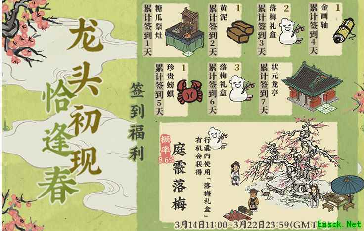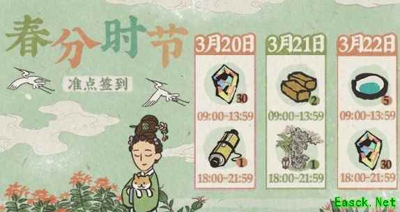 该卡池天级居民「唐伯虎」概率提升。消耗150黄泥可兑换「唐伯虎」,此外该卡池可抽取「唐伯虎」专属珍宝「桃花枝」。 春分准点签到 活动时间:3月20日—3月22日