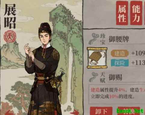 二、属性 建造:14+ 探险:8+ 三、天赋 天赋:御赐建造属性提升4%。 展昭装备时建造属性提升4%。建造生产建筑时,立即完成10%的进度。