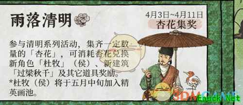 杏花作用介绍【作用介绍】 可以消耗杏花来兑换新角色「杜牧」(侯)、新建筑「过梁秋千」及其它道具奖励。