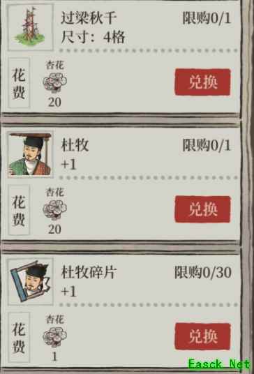 《江南百景图》杏花兑换奖励顺序推荐杏花目前可以兑换过梁秋千,候级角色杜牧、杜牧碎片、金画轴、画泥。
