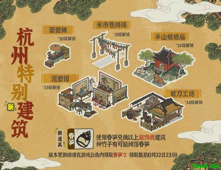 春笋兑换建筑推荐 1、面塑摊,30级解锁。 2、米市巷绣球,31级解锁。 3、半山娘娘庙,32级解锁。 4、泥塑园,33级解锁。 5、剪刀工坊,34级解锁。