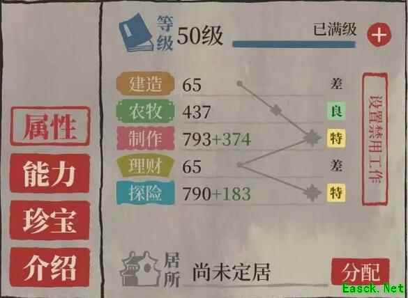 【人物属性】 初始属性:建造21,农牧241,制作155,理财21,探险175 满级属性:建造65,农牧437,制作793,理财65,探险790