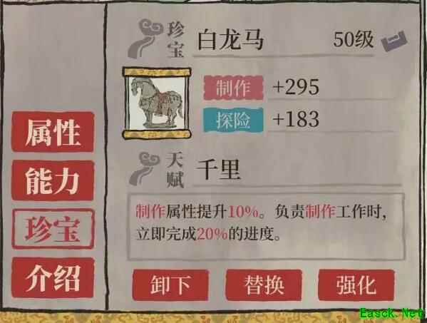 【双倍书籍】 天工开物、西游记 【天赋-奇趣】 负责2小时以上的制作工作时,随机获得50份/70份/100份资源,且所需工人-1/-2/-3。 【珍宝推荐】 专珍:白龙马 其他:青铜爵