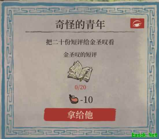 金圣叹的短评任务攻略【任务攻略】 这是之后的活动,所以不需要着急去寻找,活动还没开启。5月1号上线金圣叹,同时会有四大奇书系列活动,可能和这个活动有关。