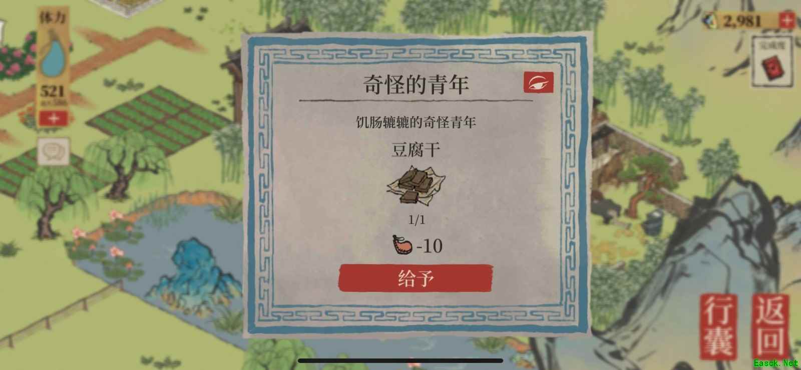 新增内容 江南百景图应天府探险第三章丽娘府宅新增: 在右上角多了一块迷雾,点击迷雾前的牌坊,然后进入,在第三个房子兑换豆腐干,然后将豆腐干交给奇怪的青年,这些就是目前新增的任务,后面的任务还没更新,需要等到下次活动了。