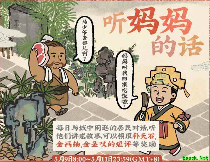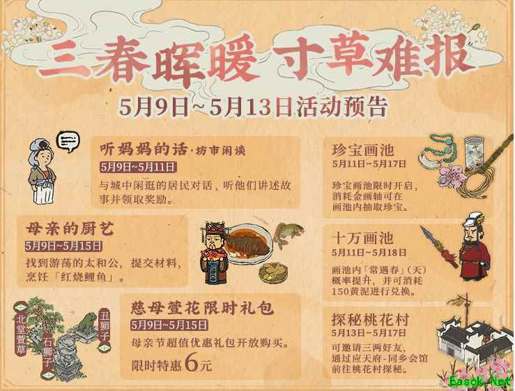 《江南百景图》母亲节活动内容一览一、5月9日-5月11日,【听妈妈的话】坊市闲谈开启。 与城中闲逛的居民对话,听他们讲述故事即可领取奖励;