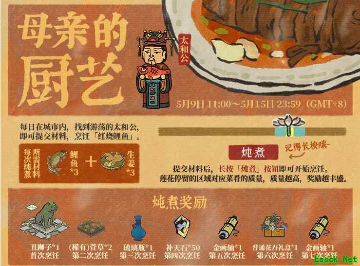 二、5月9日-5月15日,【母亲的厨艺】活动开启。 在城中找到太和公,提交食材,烹饪红烧鲤鱼即可领取奖励,其中首次烹饪的基础奖励可直接获得小装饰【丑狮子】;