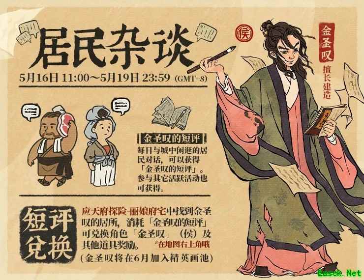 金圣叹的短评道具获取攻略【获取攻略】 5月16日-5月19日,【居民杂谈】活动第二期开启。 与城中闲逛居民对话,获取【金圣叹的短评】道具。