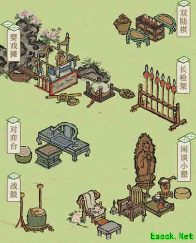 严大人上新小装饰介绍【小装饰介绍】 1、双陆棋 2、长枪架 3、婴戏摊 4、对弈台 5、战鼓 6、闲谈小憩
