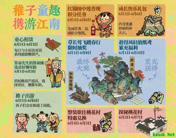 1、6月1日-6月6日,【红锦绫中莲香现】积分任务开启。 活动期间,完成任务达成积分,可获得新闲人【哪吒】等奖励; 2、6月1日-6月6日,【成长快乐】礼包开放购买; 3、6月1日-6月8日,【草长莺飞踏春行】限时抽奖活动开启。 活动期间,参与抽奖即可获得【狗狗留像板】等诸多奖励,最终大奖为新动态建筑【放鸢台】; 4、6月1日-6月10日,【趁得风轻放纸鸢】累充福利活动开启。 活动期间,充值一定数额补天石即可额外获得补天石、金画轴及新动态建筑【放鸢台】; 5、6月3日-6月5日,【整装欲往桃花村】特惠兑换开启; 6、6月3日-6月7日,【探秘桃花村】开启。 以上就是《江南百景图》甜甜糖葫芦获取攻略,更多游戏攻略请持续关注手游网! 本文内容来源于互联网,如有侵权请联系删除。 |