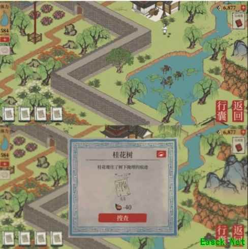 首先,我们看看一为起始三为相隔的意思。 大概的意思就是指这个纸条的字数,13相隔 其中第一个,就是驿字,然后三为相隔,就是后面隔开三个字。 也就是驿供奉伞站,这个一,代表的就是第一个字驿,然后后面隔开三个字,取第四个字,就是站。 根据这个规则,可以得出一个线索,就是驿站后池塘旁桂花树 然后来到驿站如图所示的这个地方,即可顺利找到宝箱,完成线索。
