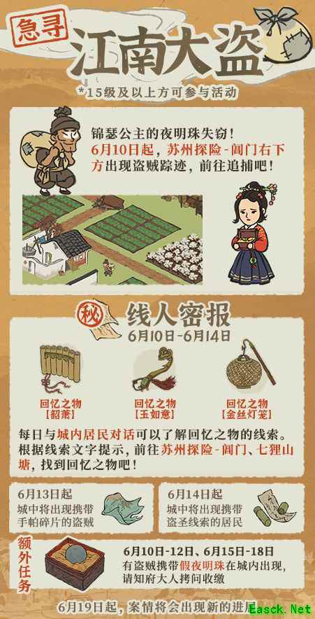 《江南百景图》江南大盗活动攻略惊闻江南大盗现身小镇,锦瑟公主的夜明珠深夜遭窃! 特邀知府大人明察秋毫,速速破案! 游戏活动详情 6月10日起,苏州探险-阊门附近将留下盗贼出没踪迹。 知府大人(游戏等级>=15)可前往现场开启你的破案之旅; 6月10日-6月14日,每日与城内居民对话可搜集到【回忆之物】相关线索,根据线索上的文字提示,前往 苏州探险-阊门/七狸山塘 附近寻找【回忆之物】吧; 6月13日起,城中将出现藏有【手帕碎片】的盗贼,收集关键线索助力破案;