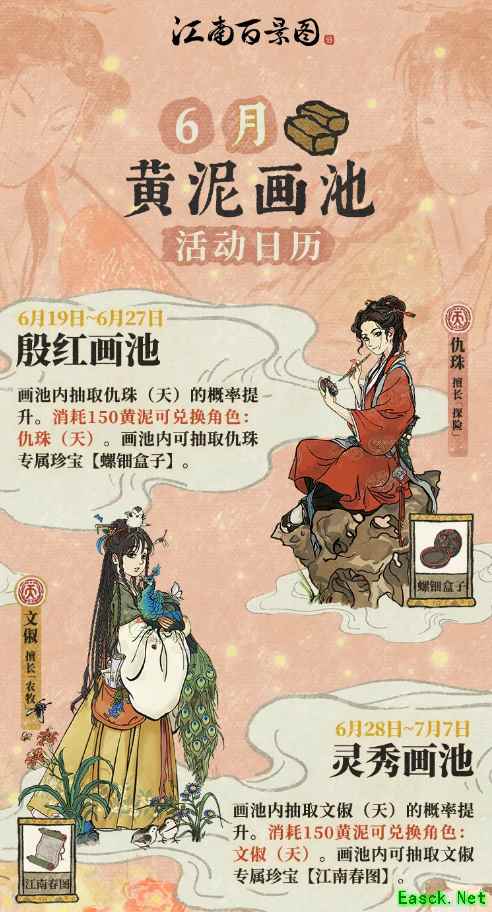 6月黄泥画池活动介绍画池具体内容如下: 以下所有黄泥画池均可消耗150黄泥直接兑换相应的天级居民,并且可以抽取相应天级居民的专属珍宝。 6月19日11:00至6月27日23:59,【殷红画池】开启!天级居民【仇珠】概率提升; 6月28日11:00至7月7日23:59,【灵秀画池】开启!天级居民【文俶】概率提升。