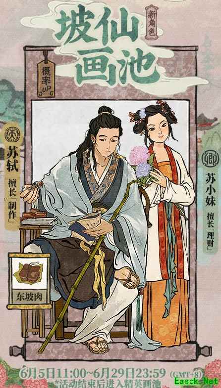 《江南百景图》苏轼获得方法一、获得方法 6月5日-6月29日,【坡仙画池】开启。天级新角色【苏轼】进入该画池,天级居民【苏轼】及其专属珍宝【东坡肉】概率提升。活动结束后【苏轼】进入【精英】画池。
