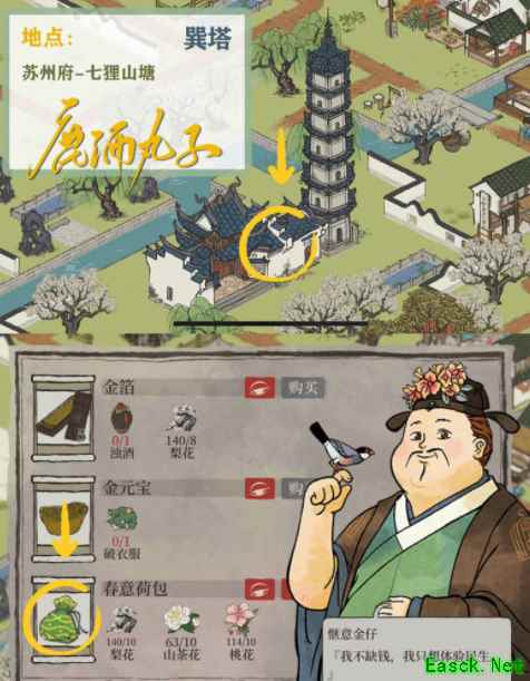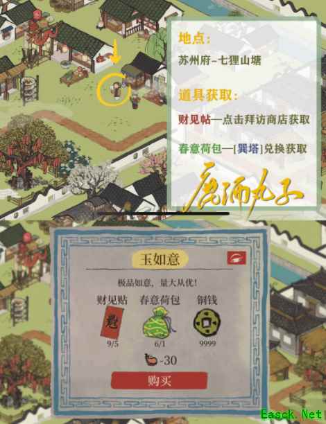 玉如意→获取地点[苏州探险·七狸山塘] 所需物品获取↓ 财见贴—点击拜访七狸山塘的商店获取 春意荷包—[巽塔]兑换获取 [巽塔]→位于苏州探险·七狸山塘