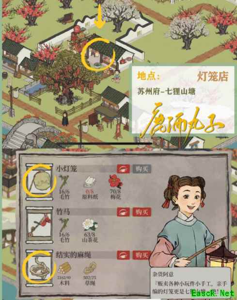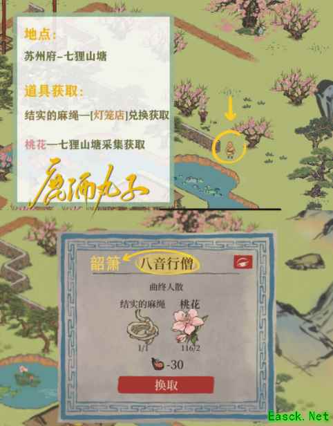 韶箫→获取地点[苏州探险·七狸山塘] 所需物品获取↓ 结实的麻绳—[灯笼店]兑换获取 桃花—七狸山塘采集获取 [灯笼店]→位于苏州探险·七狸山塘