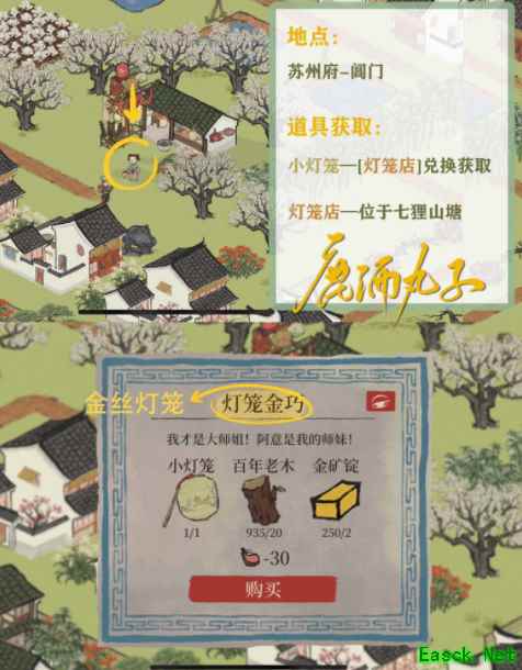 金丝灯笼→获取地点[苏州探险·阊门] 小灯笼—[灯笼店]兑换获取 [灯笼店]→位于苏州探险·七狸山塘