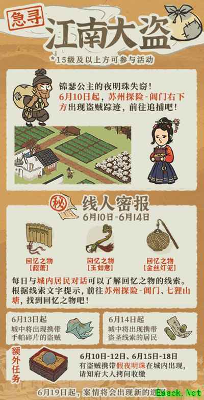 江南百景图江南大盗活动介绍: 惊闻江南大盗现身小镇,锦瑟公主的夜明珠深夜遭窃! 特邀知府大人明察秋毫,速速破案! 6月10日起,苏州探险-阊门附近将留下盗贼出没踪迹。 知府大人(游戏等级>=15)可前往现场开启你的破案之旅。