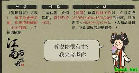《江南百景图》苏小妹天赋介绍琴棋好闲日,诗酒正年华 —— 苏小妹 天赋 【聪慧】负责理财工作时,立即完成2%/6%/10%/15%/20%的进度,且所需工人+0/+0/+1/+1/+1。(人物品阶越高,立即完成的进度越多。)
